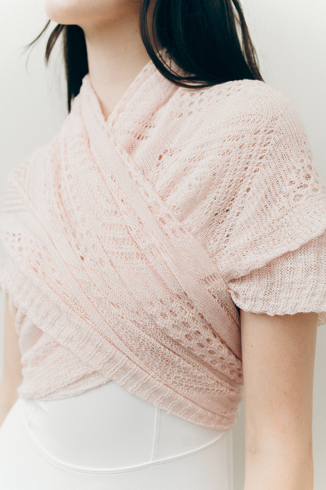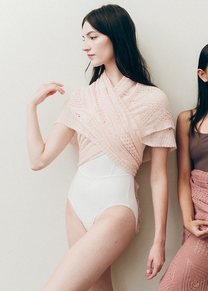 The Slipper Alina Shawl features a delicate ballerina blush tone in a soft, breathable knit. Ideal for layering and adds warmth and elegance to any outfit.