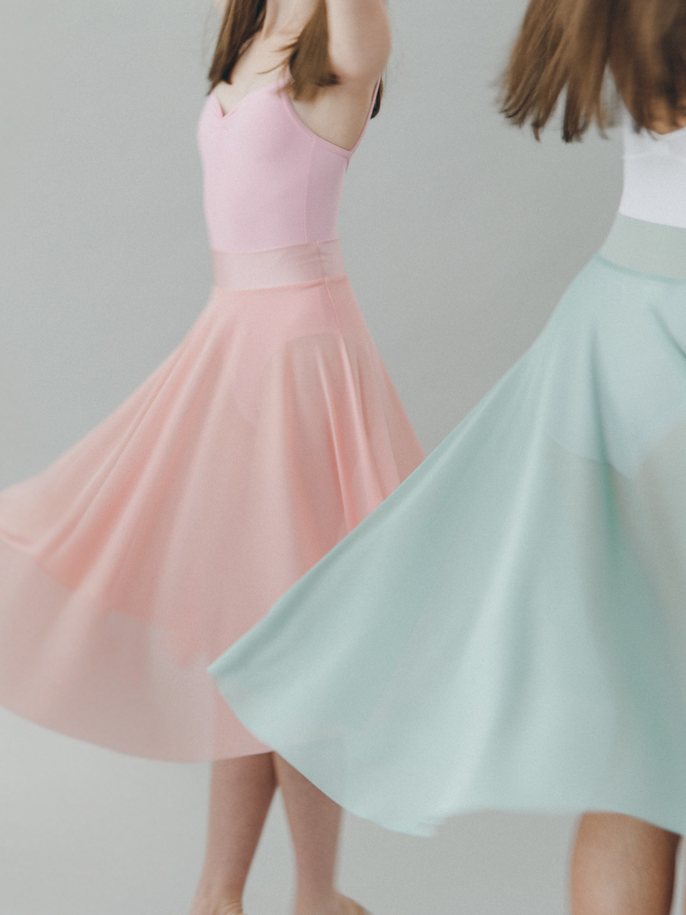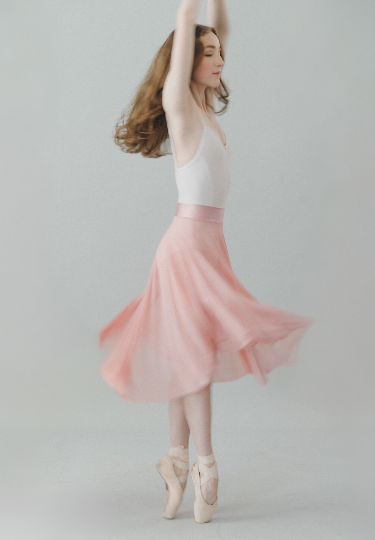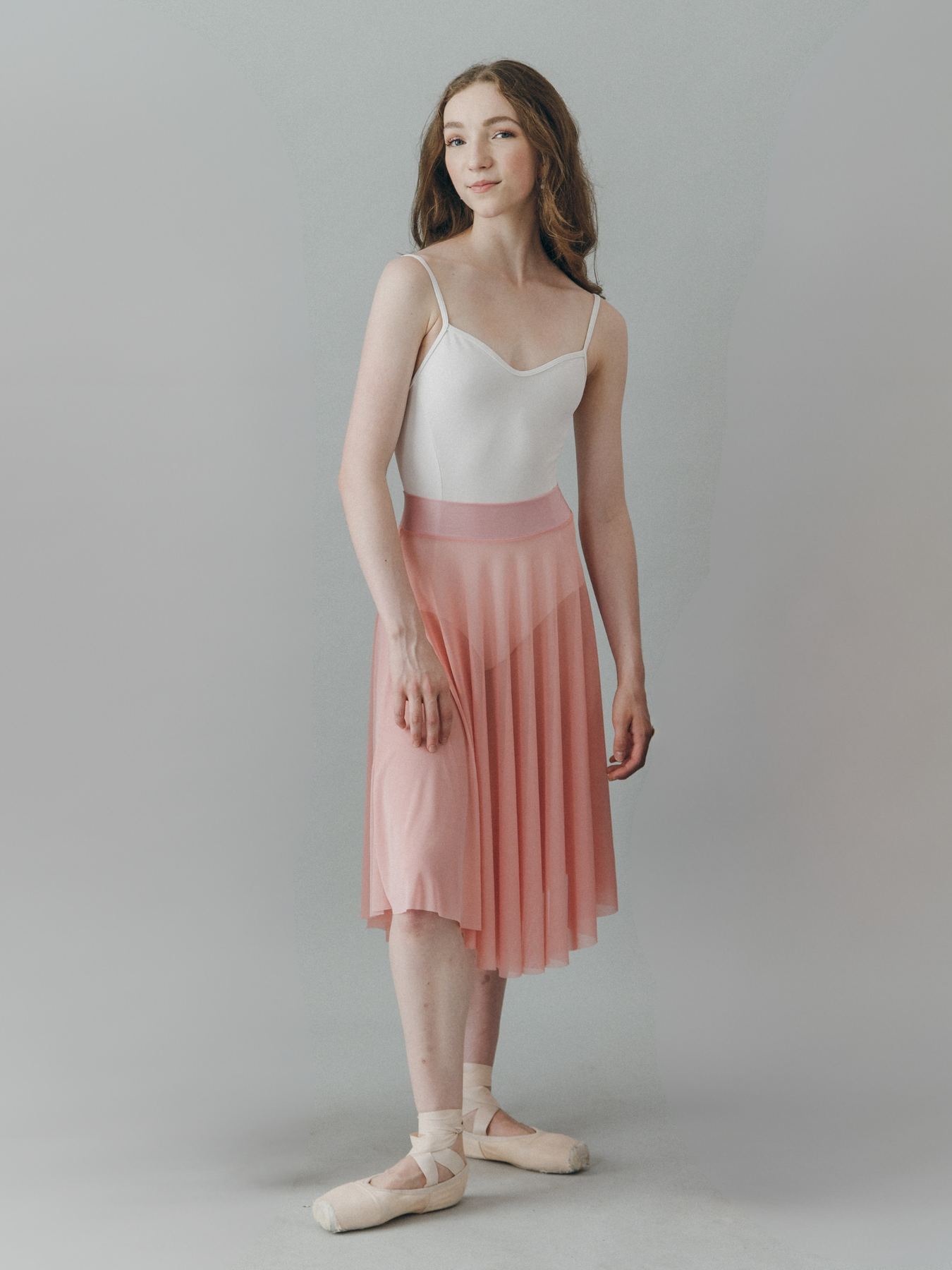 The Willa Grace Skirt features a soft pastel pink tone in lightweight, flowy fabric, perfect for adding gentle elegance and fluid movement to your dancewear look.